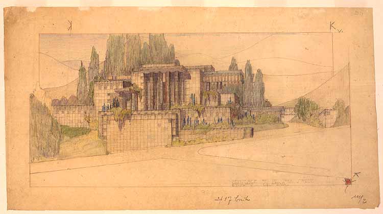 flw_drjohn_storer Published September 18, 2012 at 750 × 419 in The Inspirations: Frank Lloyd Wright ← Previous Next → Storer House Sketch by Frank Lloyd Wright